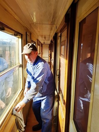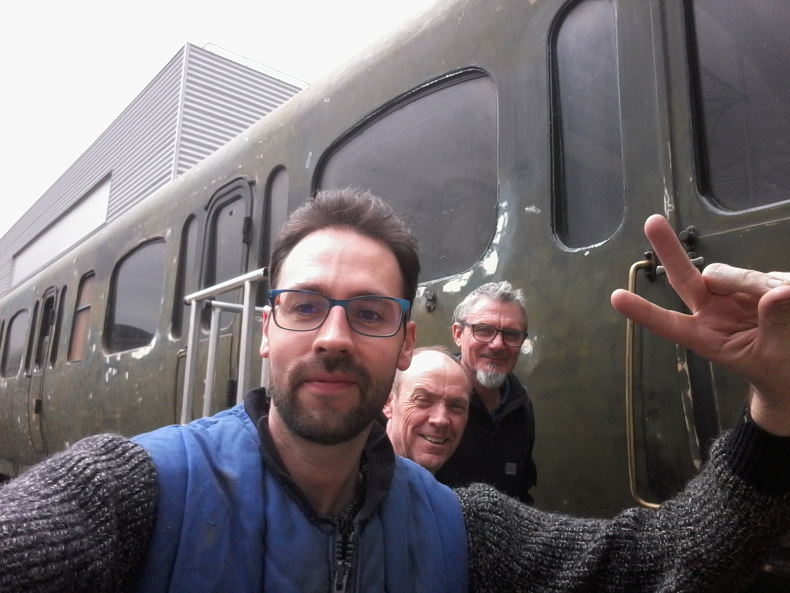 Les voitures à voyageur stationnant à l’extérieur, il est nécessaire de reprendre leur peinture tous les 4 à 5ans pour préserver la protection des tôles. Cette année c’était au tour de la voiture USI A4B5 (4 fenêtres de 1ère classe, 5 de 2nde classe), où est aménagé le bar-boutique-souvenir